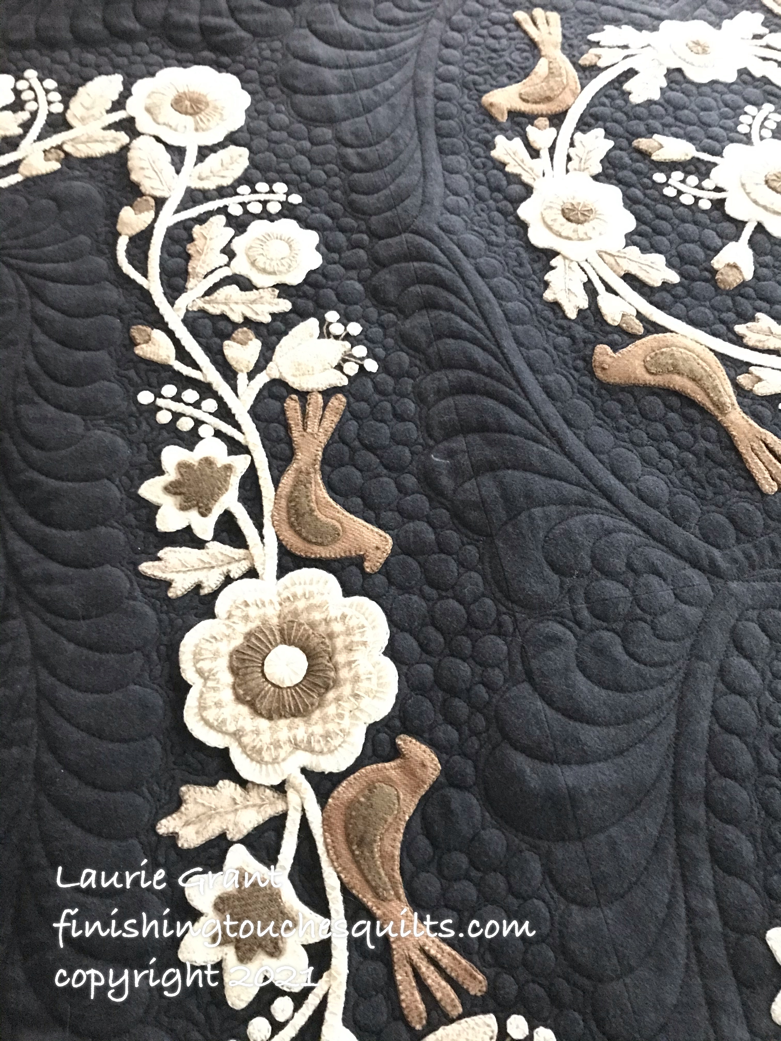 This beautiful quilt was appliquéd and pieced by one of the most talented people I’ve ever met. I have had the privilege of quilting for Heidi many, many times over the last 9+ years. This quilt, Twilight Garden, was a 2019 Block of the Week designed by Lisa Bongean of Primitive Gatherings. To see more detailed photos, click here.